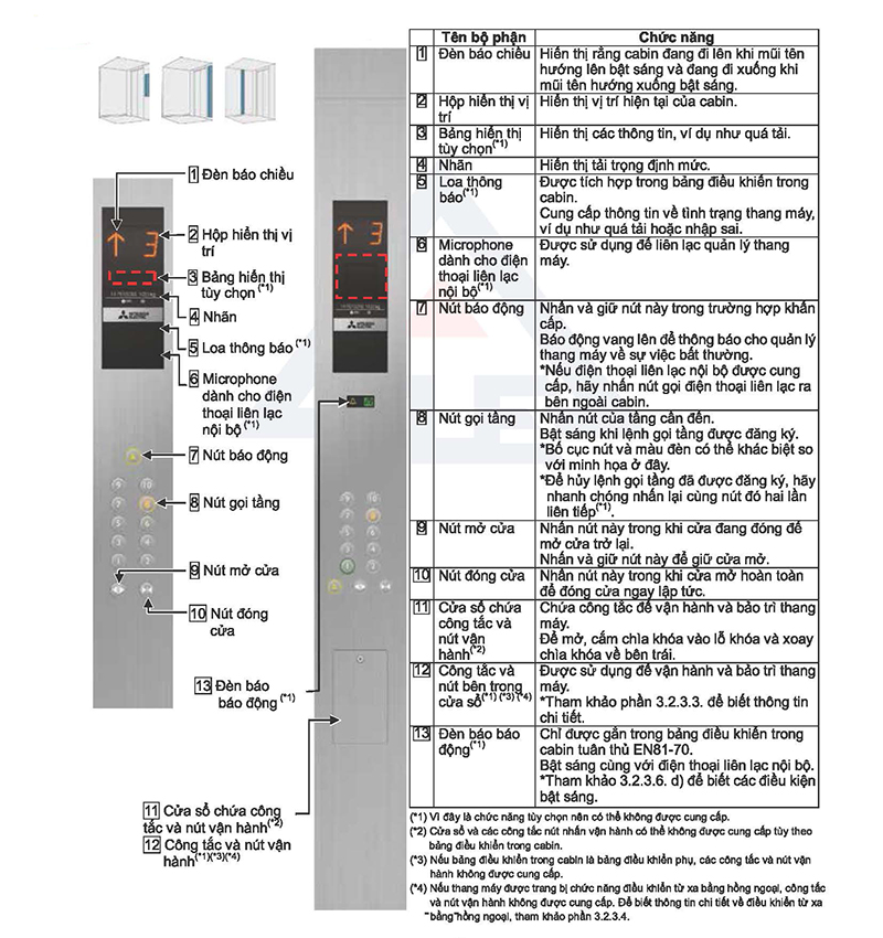 Bên trong thang máy cũng có cabin, thường ở vị trí bên phải của cửa thang máy. Bên bảng điều khiển này có các nút chức năng như sau: